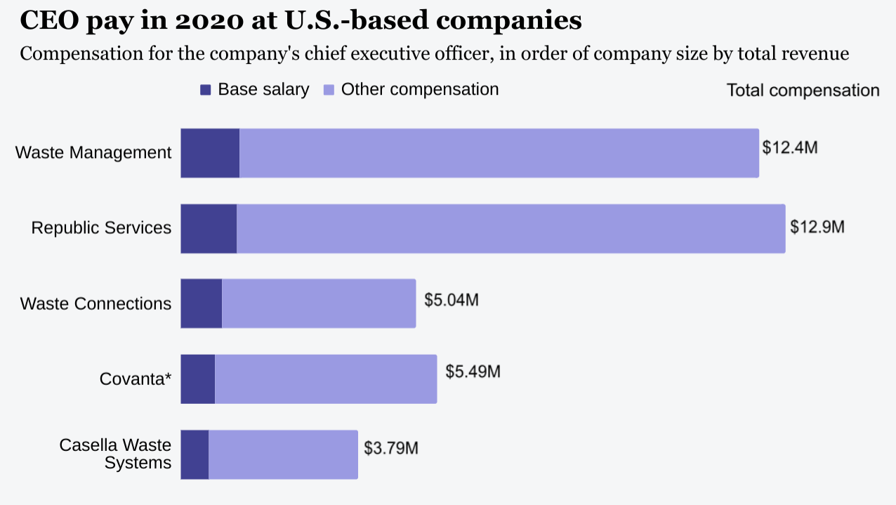 While the pandemic had an initial effect on financial results last year, and Covanta's former CEO took a temporary pay cut, companies gradually rebounded along with their stock prices. Because executive pay is often tied in large part to stock performance and other metrics, the trend of rising CEO salaries continued for the waste and recycling industry in 2020.